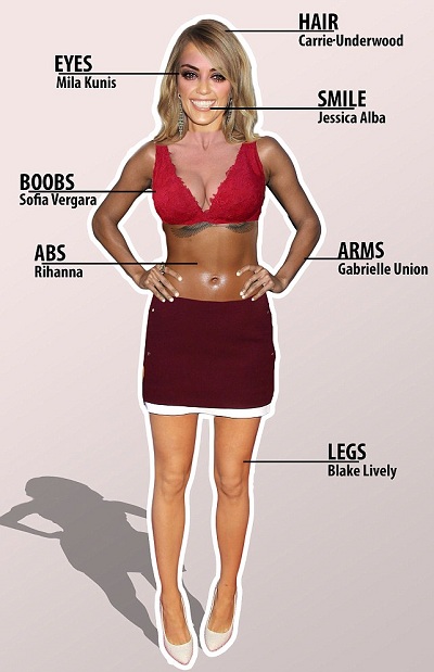 Najbolje karakteristike poznatih ljepotica krase savršenu ženu, ona ima osmijeh kao Jessica Alba, trbušne mišiće kao Rihanna i plave uvojke kao Carrie Underwood.