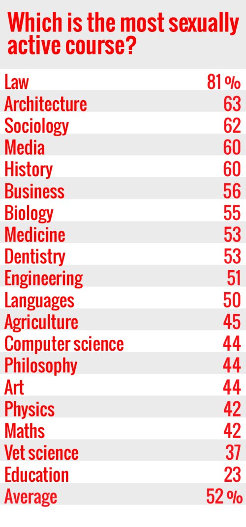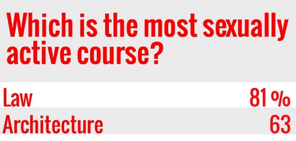Budući arhitekti, sociolozi i studenti medija slijede živahne pravnike sa 60% onih koji su izjavili da se seksaju, a studenti koji studiraju edukaciju zadnji su na listi sa svojih bijednih 23% seksualno aktivnih studenata u trenutku provođenja ankete.